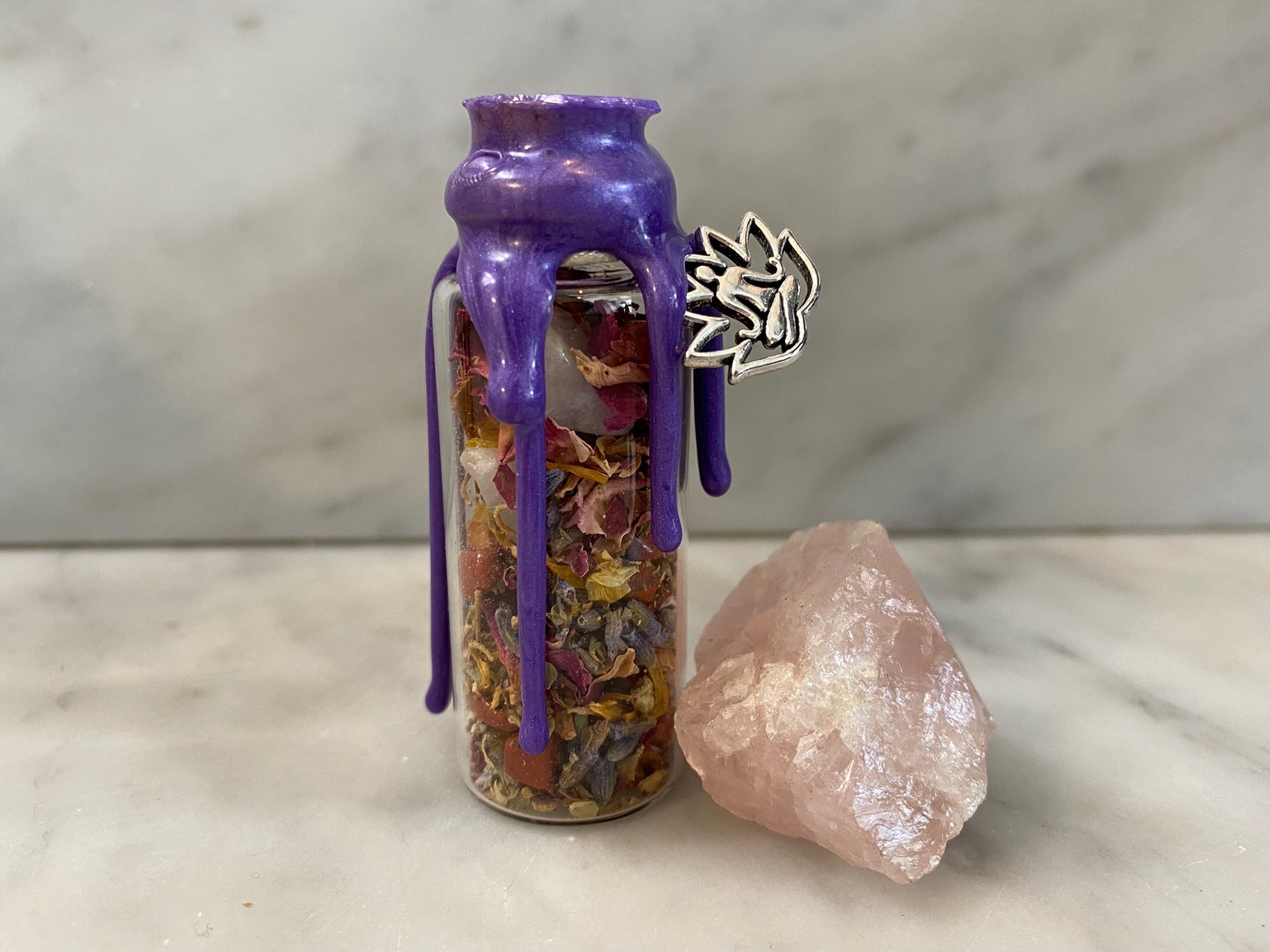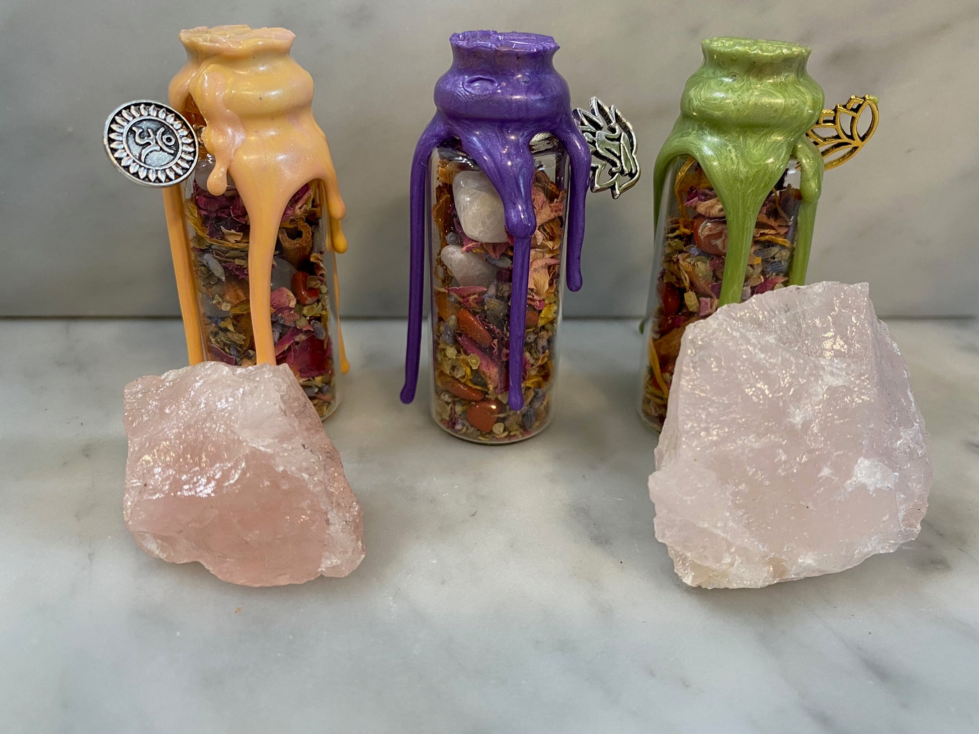 With a special assortment of loving crystals, Rose Quartz and Red Jasper! And Herbs such as Rose, Oregano, Cinnamon, and Lavender. Sealed with colored wax and Healing Reiki Energy!